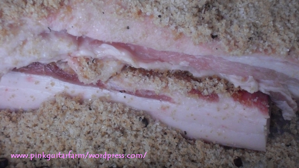 No wonder the pig is such a huge part of history, life and culture in the South. The three words that come to mind regarding the settling of a varied unforgiving terrain, a hard farming life and long barren winters could be distilled down to: corn, whiskey and pork. Not necessarily in that order. Not only is the hog part of our biodynamic, holistic farming program as in tilling and amending our soil but the gifts provided afterward are nothing short of amazing. That is what our bacon was: AMAZING. Here is how we did it: