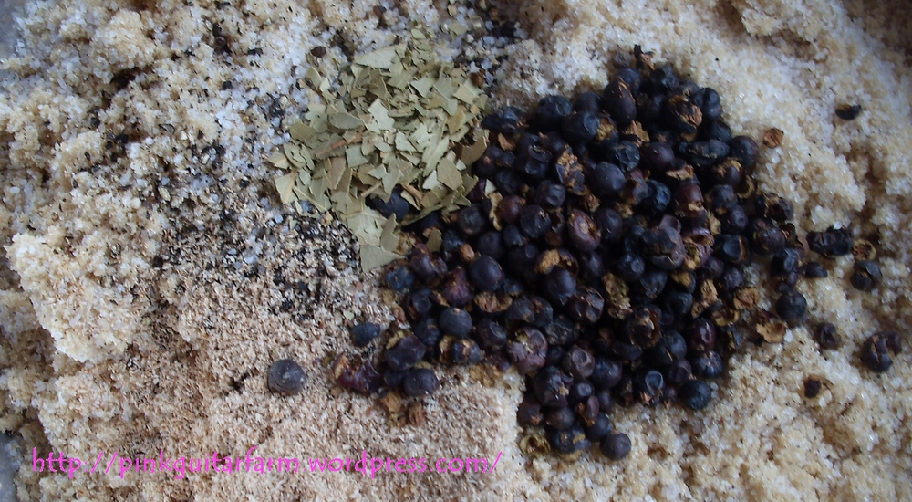 We opted for the salt/brown sugar cure with as many spices as we could find. The aroma of the juniper berries alone was enough to make me reach for the martini glasses.