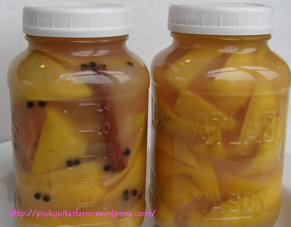 I forged forward using the recipe for the Moroccan Lemons, again, in The Joy of Pickling book, by Linda Ziedrich (pg. 156). While I was preparing this very easy recipe, I thought about what goes with grapefruit. Crab, chicken, halibut, avocado, lemon thyme, parsley, cloves, cinnamon and why do I keep seeing a fresh red-orange papaya chopped up with the rinsed, preserved grapefruit, Italian parsley, red onion and fresh squeezed lime over Mahi Mahi? Must be hungry.