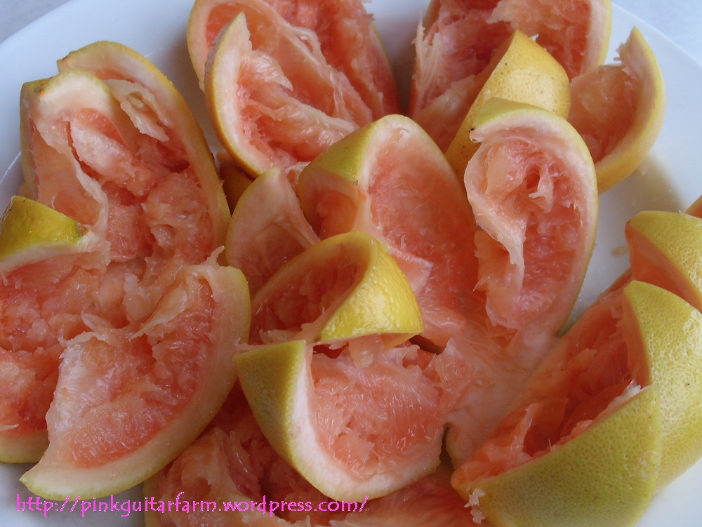 Next, I turned my attention to the grapefruit, which was not disappearing as quickly as those beautiful red navels. I was thinking Moroccan Lemons but with grapefruit. Funny how my Joy of Pickling book doesn’t have any recipes for pickling/preserving grapefruits at all. There might be a reason for this, I shall find out.